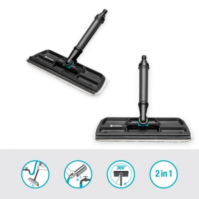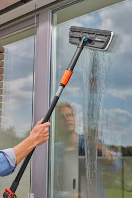Очиститель окон со стеклоочистителем Cleansystem от GARDENA, арт. 18808, с рабочей шириной 310 мм. и моющей поверхностью из микрофибры идеально подходит для мойки окон. На очистителе дополнительно установлен съёмный скребок-водосъёмник из качественной и долговечной пористой резины, который обеспечивает отсутствие разводов во время мытья. Поворотный шарнир универсальный и меняет наклон в диапазоне 360°. Очиститель окон со стеклоочистителем GARDENA может быть установлен непосредственно на садовый шланг через быстросъёмный коннектор. Либо подключен к обычной системе уличного водопровода с помощью водопроводящей ручки, через систему быстроразъёмного коннектора с резьбовым фиксатором. Для удобства эксплуатации насадок из моющей системы от GARDENA стоит купить универсальные ручки-удлинители; Рукоятка для подачи воды Cleansystem S, M, M-XL к которым можно подключать различные варианты моющих щёток.